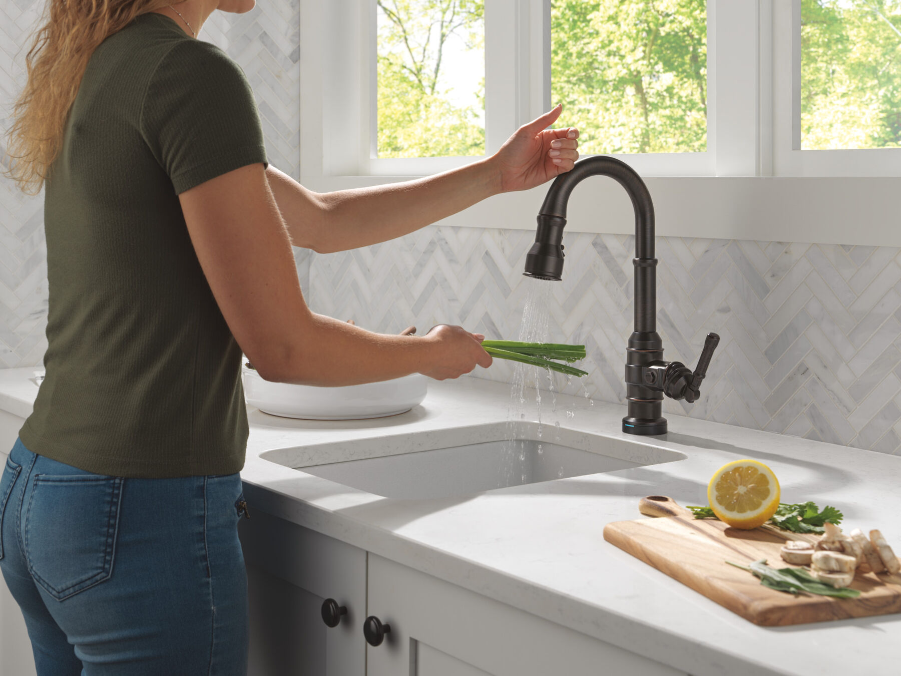 The powerful features of the Broderick® Collection take center stage in the kitchen, with an industrial style that alludes to a rich heritage. Delta® Touch2O® faucets with Touchless Technology help keep germs and mess off your kitchen faucet and provides easy water control 3 ways: simply place your hand near the faucet, tap the faucet surface, or use standard handle activation. The TempSense™ LED light changes color to alert you to the water’s temperature and eliminate any possible surprises or discomfort. MagnaTite® Docking uses a powerful integrated magnet to pull your faucet spray wand precisely into place and hold it there so it stays docked when not in use. Delta® faucets with Diamond Seal® Technology perform like new for life with a patented design which reduces leak points, is less hassle to install and lasts twice as long as the industry standard. You can install with confidence, knowing that Delta faucets are backed by our Lifetime Limited Warranty.